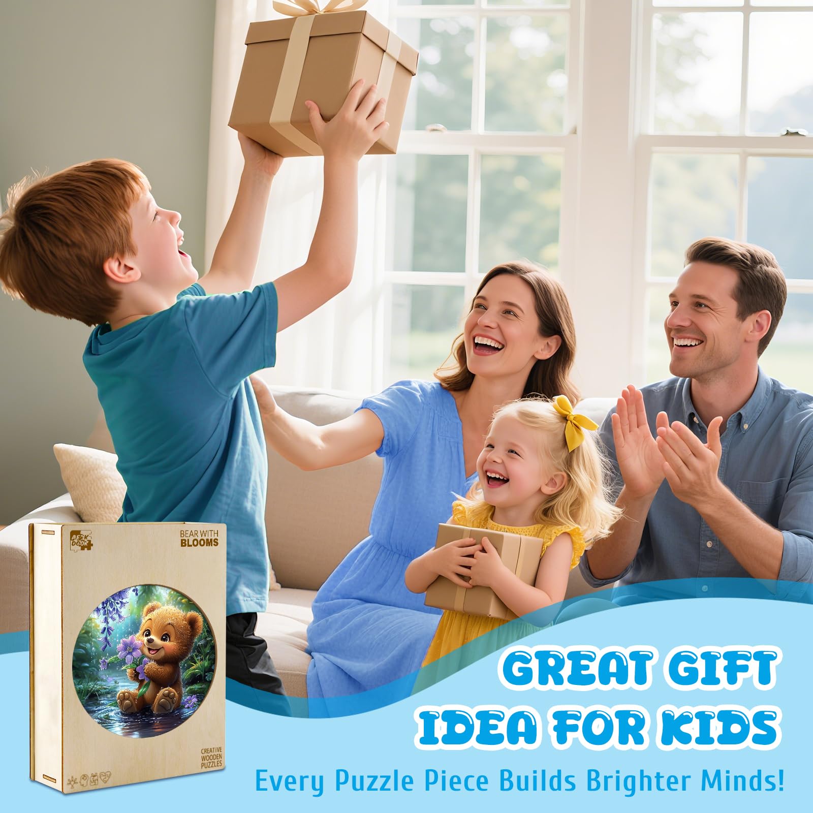 AEEKDOOK Wooden Puzzles for Kids Ages 4-6 - Bear with Blooms 50 Pieces Children Puzzles - Large Pieces Kids Puzzle with Unique Shapes - Educational Puzzles Toys for Boys and Girls (11.4 * 11.4 in)