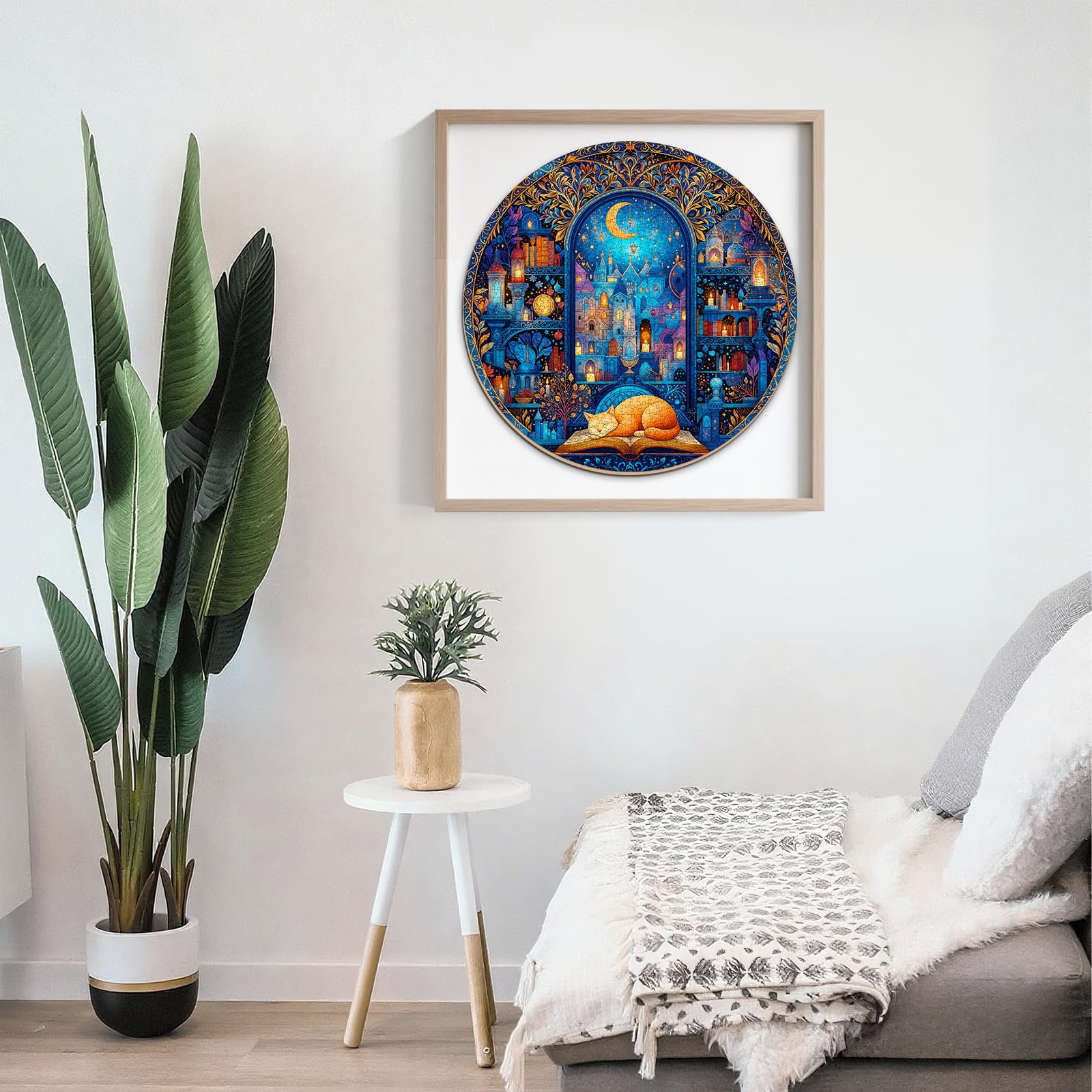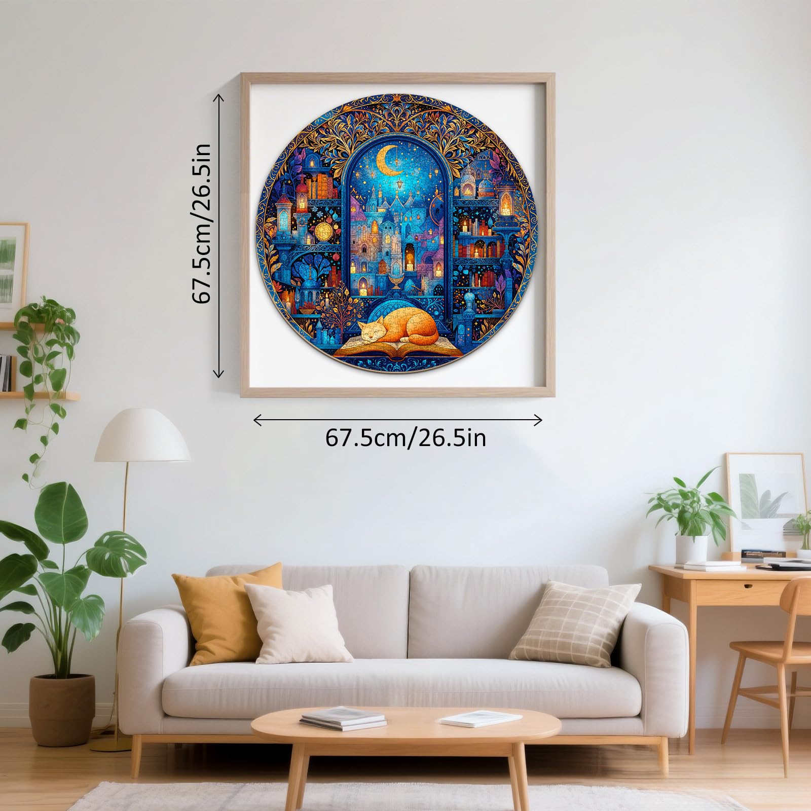 - 【Bookshelf Puzzles for Adults】 Finshed size: 26.5 * 26.5in / 67.5*67.5cm. This 1000 piece puzzle for adults shows a study room scene with a cat sleeping on a desk, bookshelves, and a city nightscape in the background.. It comes with an exquisite box and a high-resolution poster to provide reference for jigsaw puzzles.