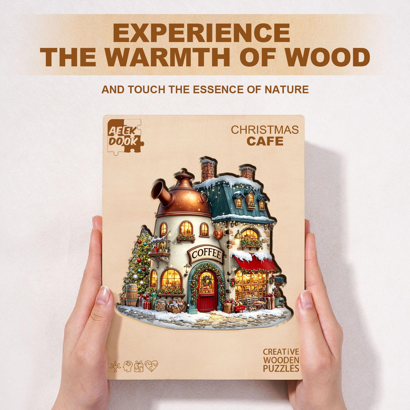 - 【Wooden Puzzles for Adults】 This wood puzzle features a whimsical Christmas coffee shop with a teapot - shaped roof, glowing windows, a decorated Christmas tree, and snowy surroundings, exuding cozy holiday charm.