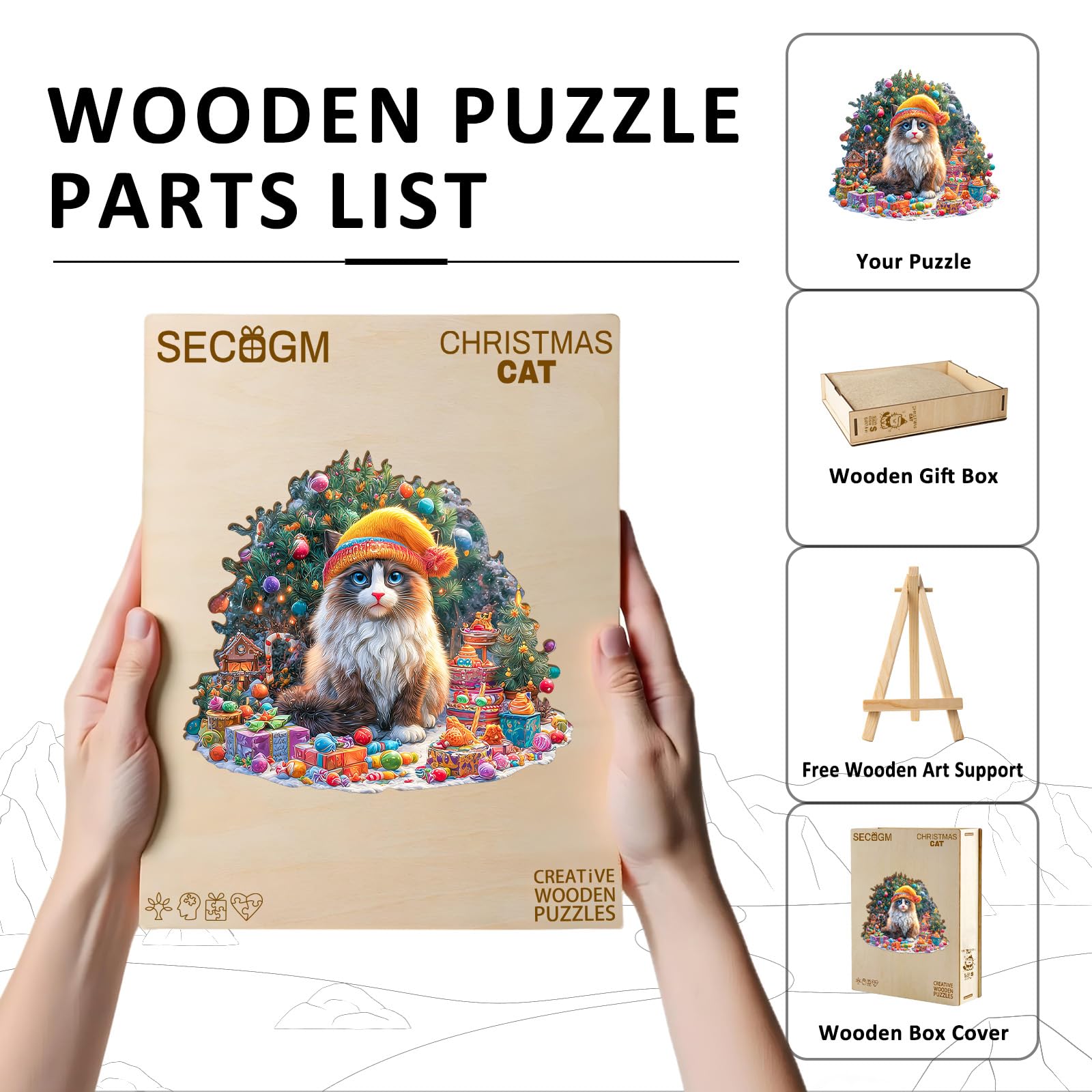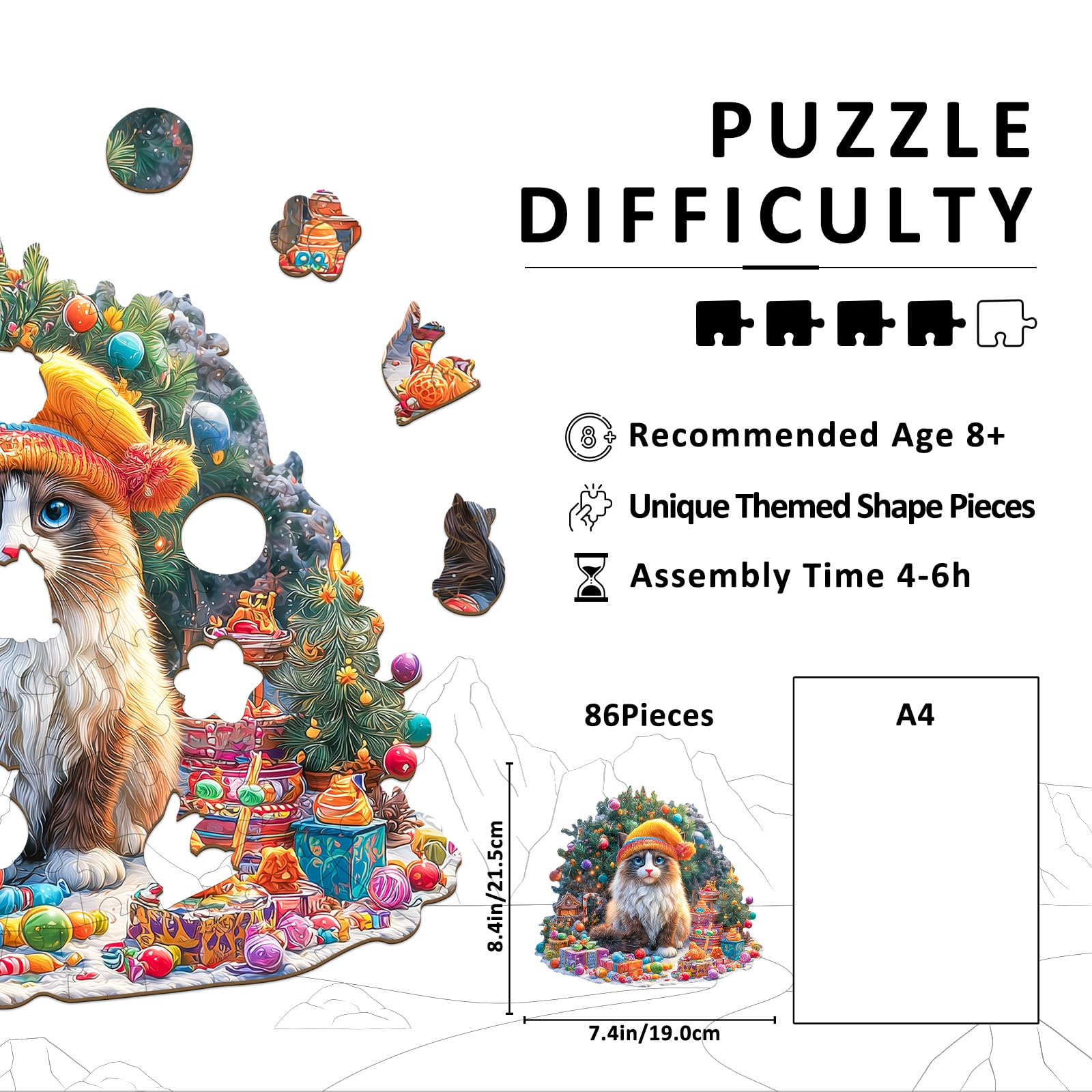 Wooden Puzzles for Adults - Christmas Cat Wooden Jigsaw Puzzle 86 pcs - Unique Animal Shape Wood Cut Puzzles - Eco-Friendly Home Office Decor (8.4 * 7.4in)