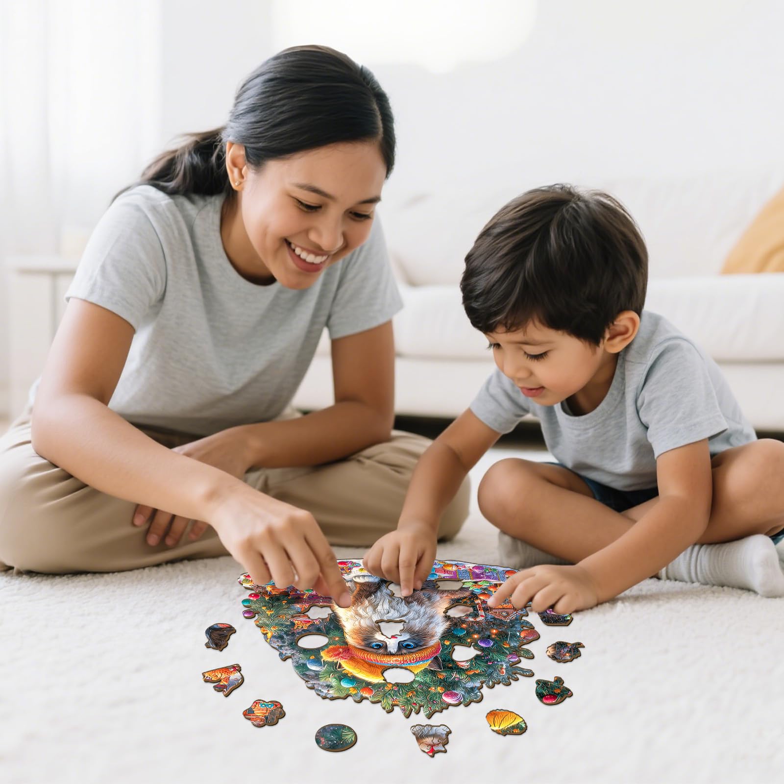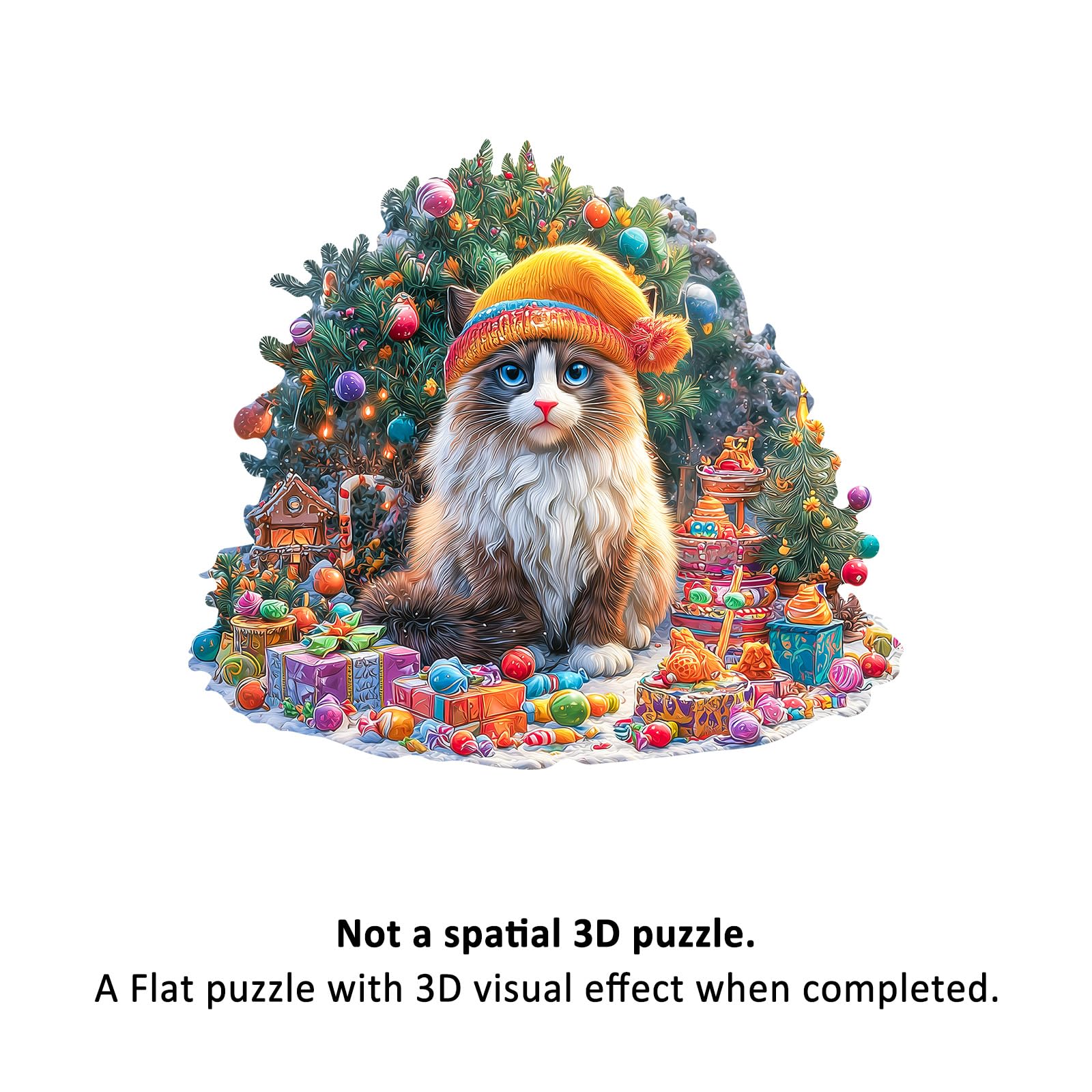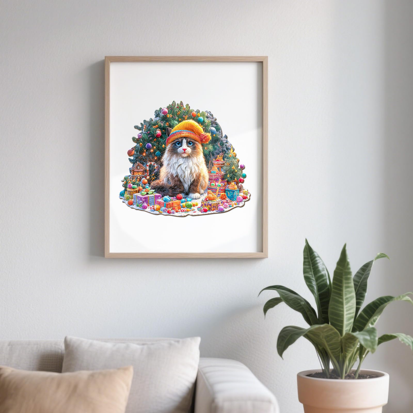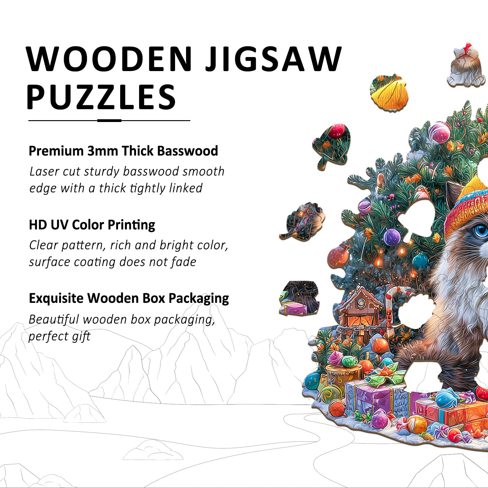 - 【Wooden Puzzles for Adults】A fluffy cat wearing a yellow knitted hat sits under a Christmas tree, surrounded by colorful ornaments, piles of gifts, and sweet treats. It brings a cozy, holiday - ready charm, perfect for spreading Christmas cheer.