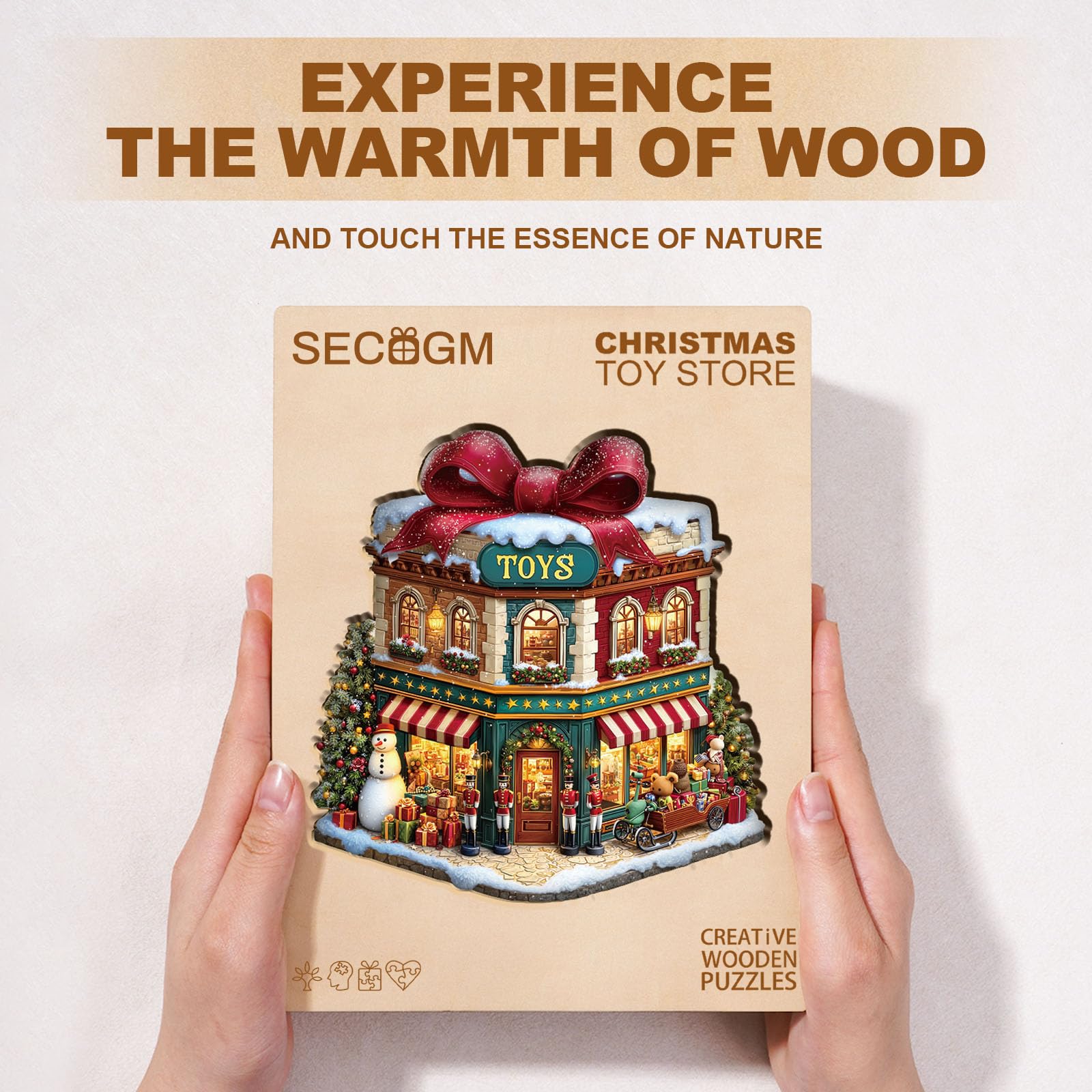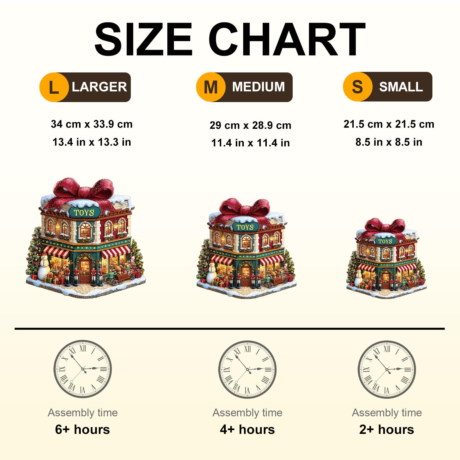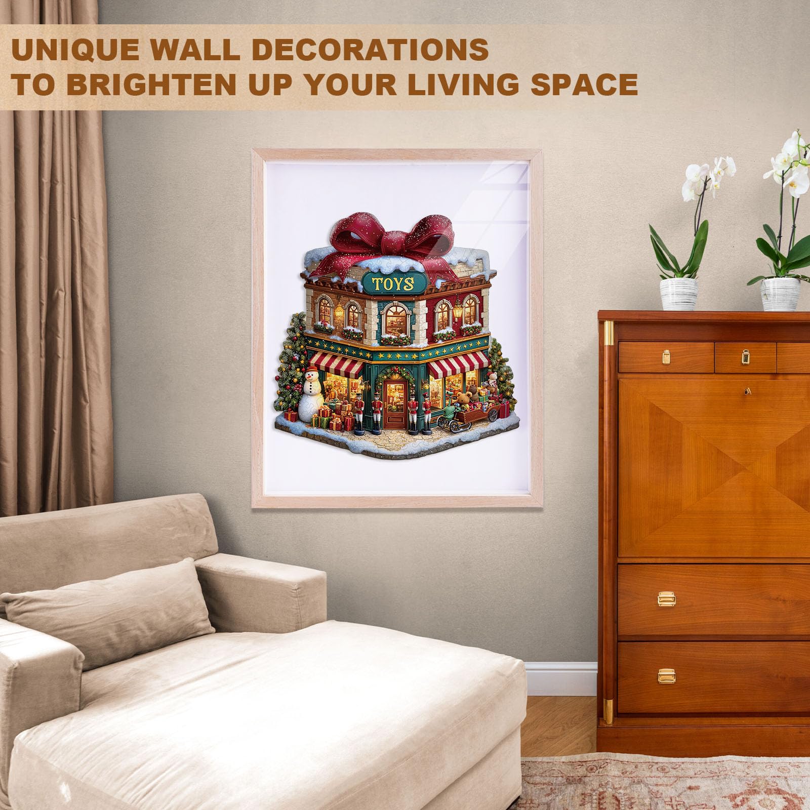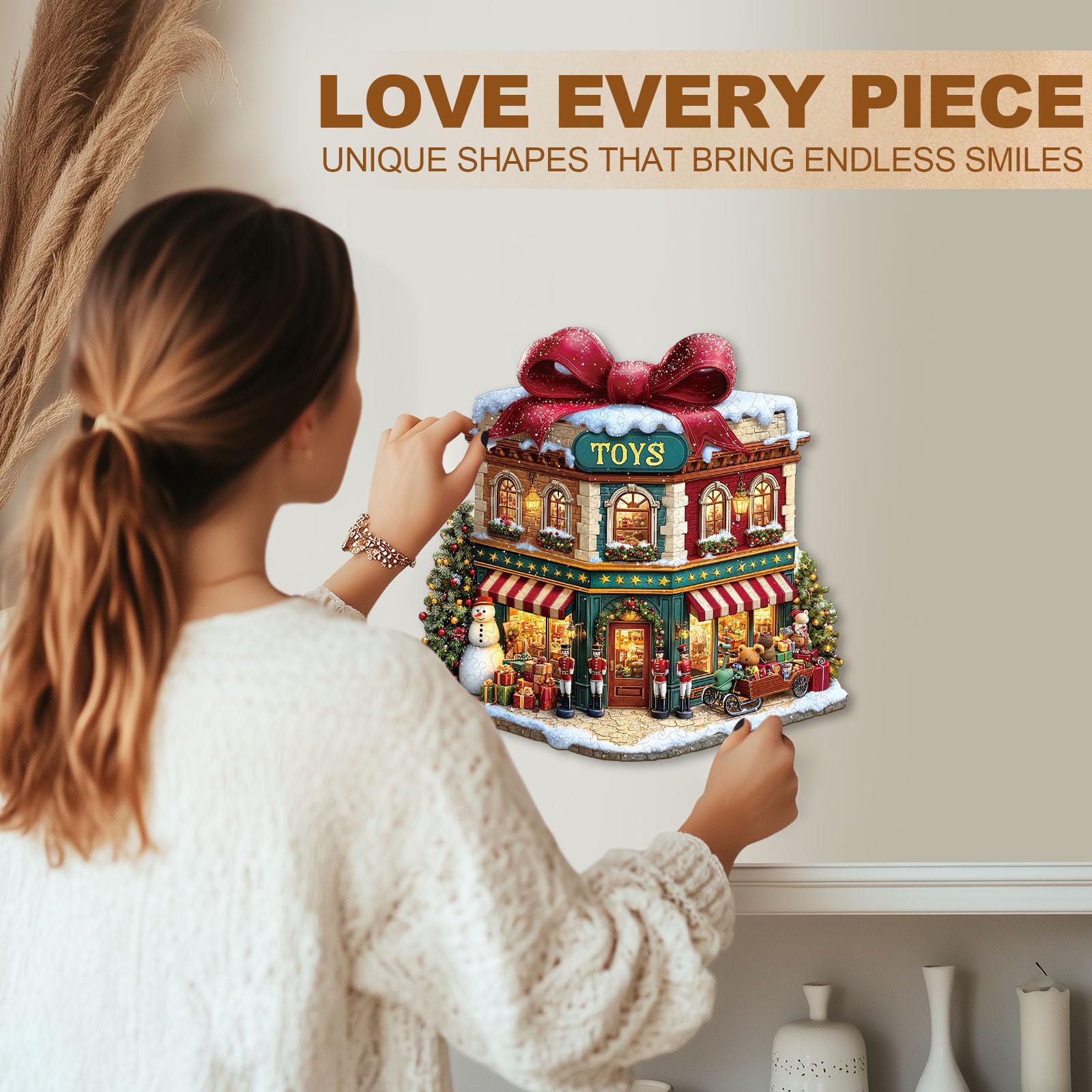 - 【Wooden Puzzles for Adults】Topped with a big red bow, a festive toy shop is decorated with Christmas trees, a snowman, toy soldiers, and piles of gifts. The warm - lit windows and charming details create a cozy, holiday - filled scene, perfect for spreading Christmas cheer.
