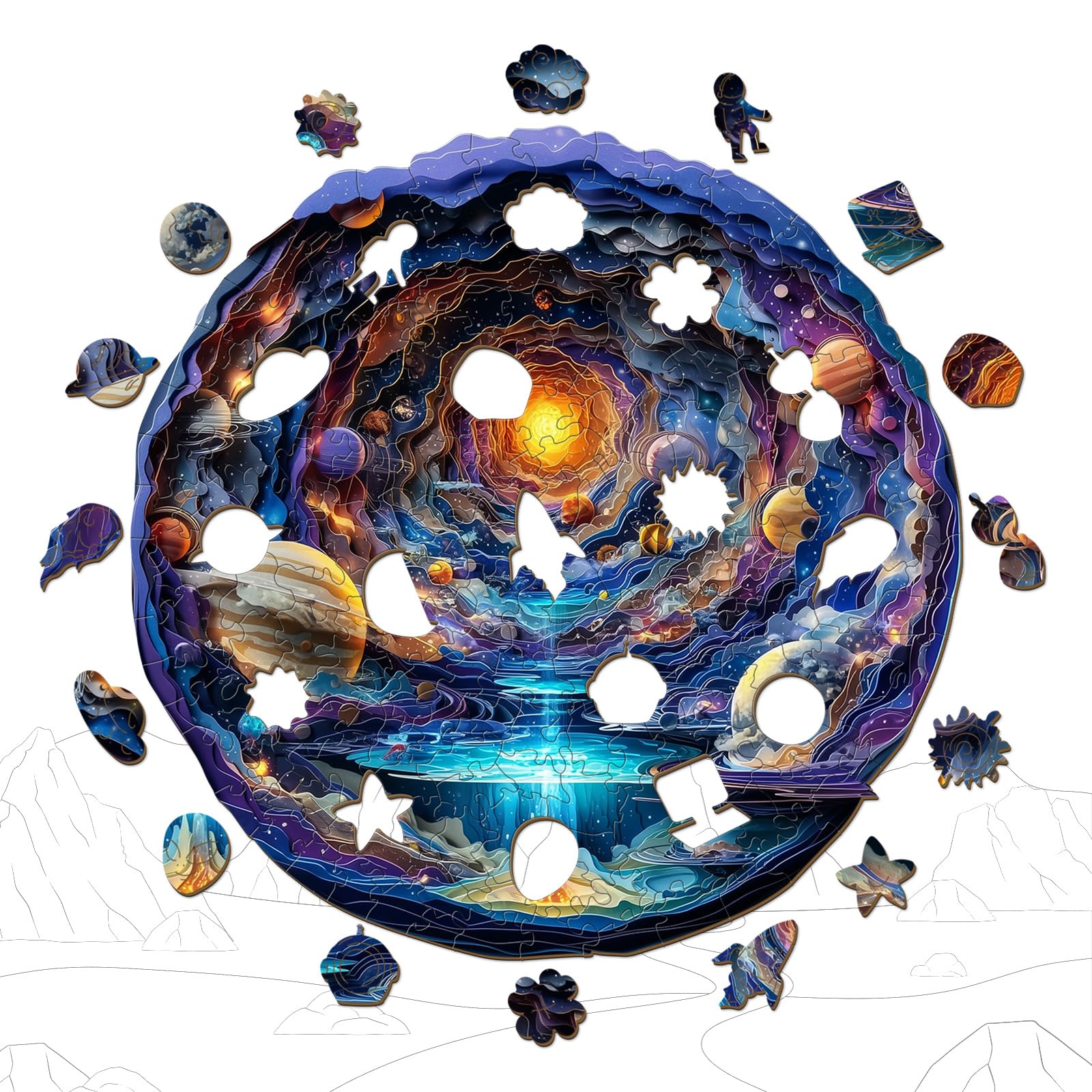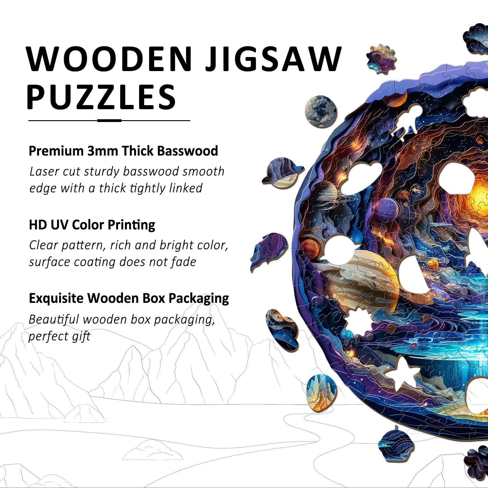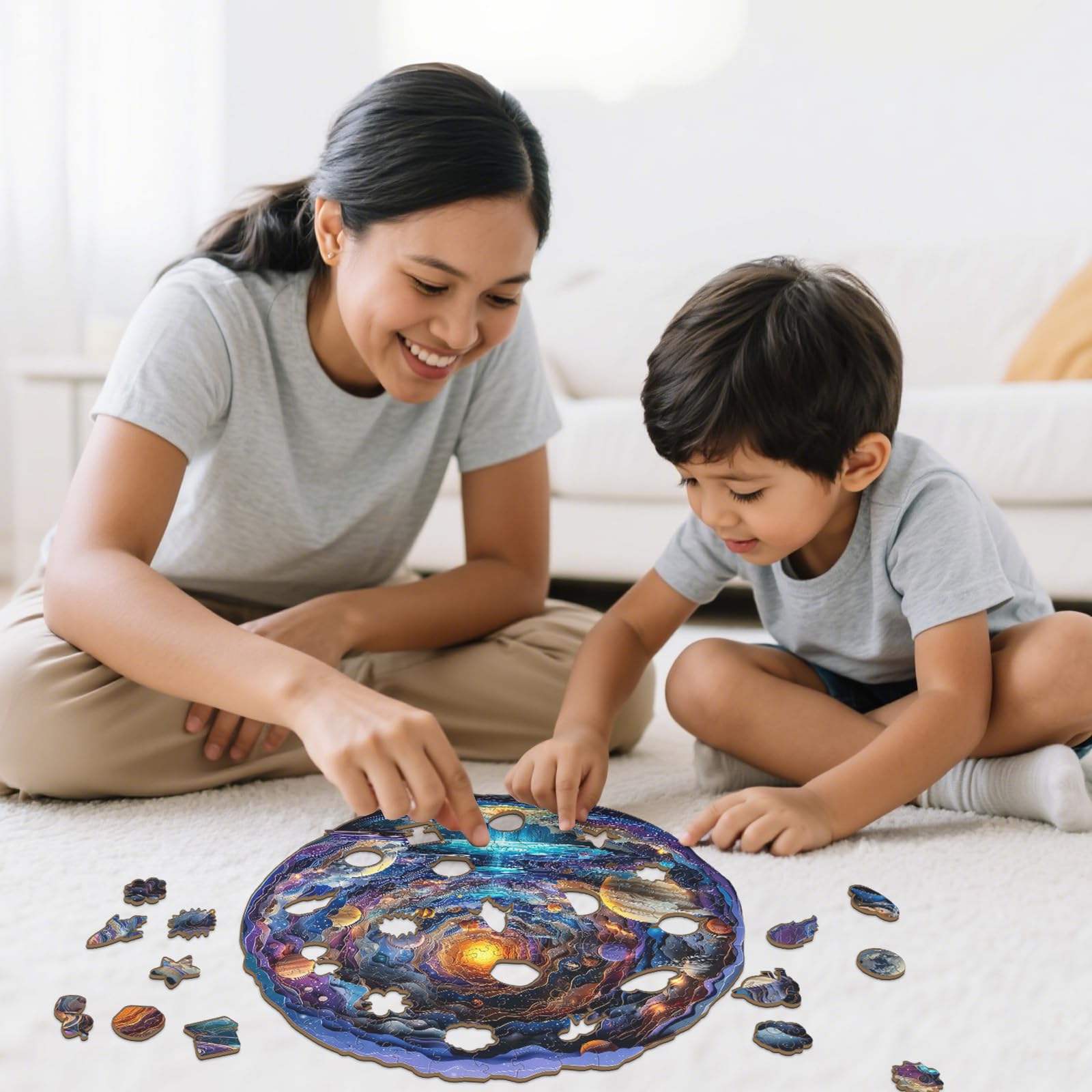 - 【Wooden Puzzles for Adults】 This wood puzzle showcases a circular cosmic scene with a glowing sun at the center, surrounded by swirling nebulas, planets, and celestial wonders, creating a mesmerizing deep - space spectacle.