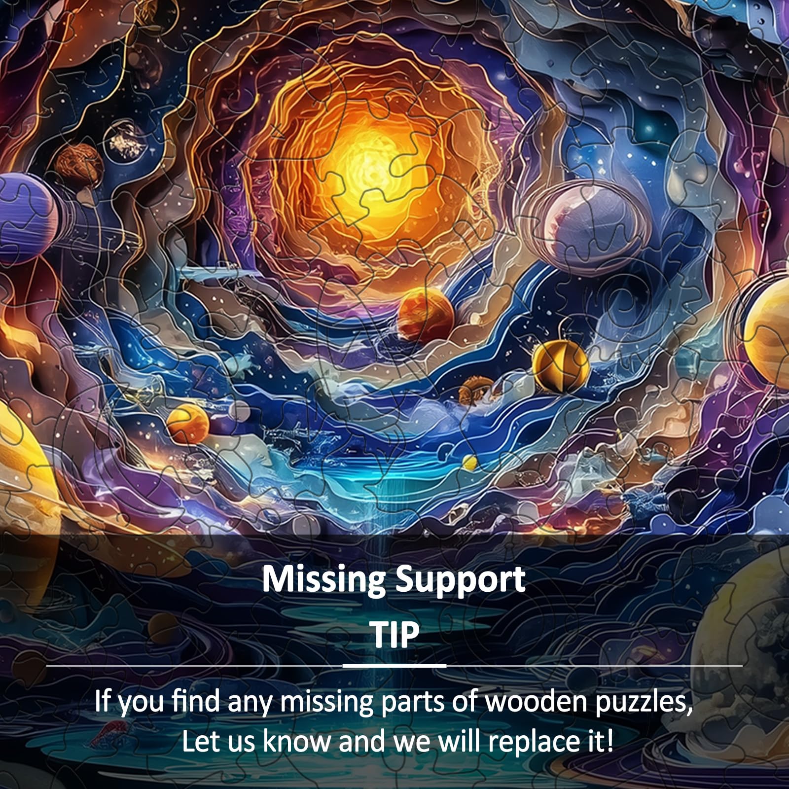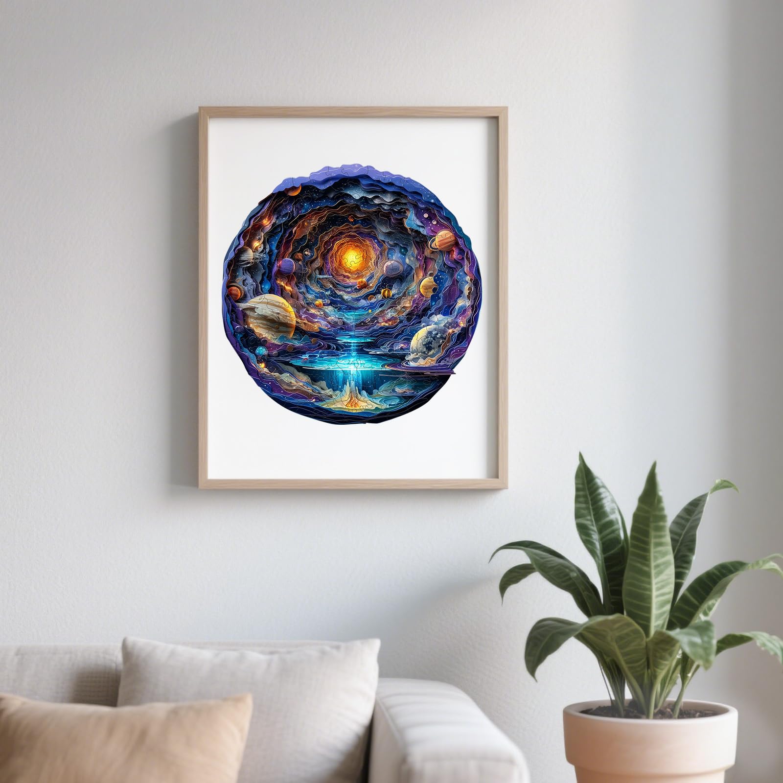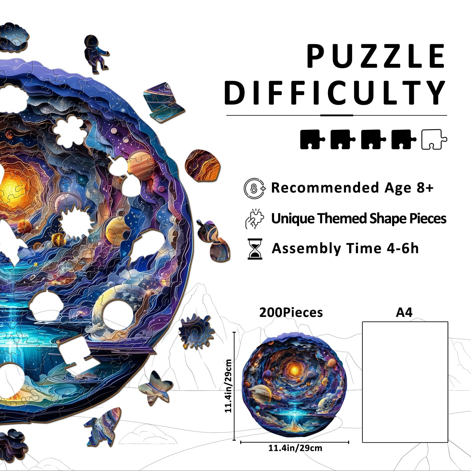 - 【Wooden Puzzles for Adults】 This wood puzzle showcases a circular cosmic scene with a glowing sun at the center, surrounded by swirling nebulas, planets, and celestial wonders, creating a mesmerizing deep - space spectacle.
