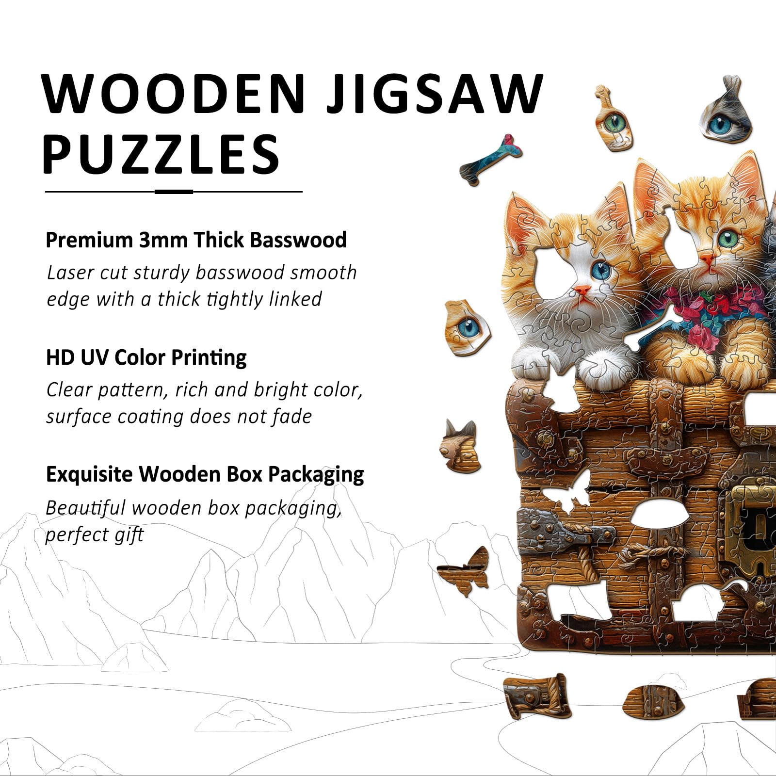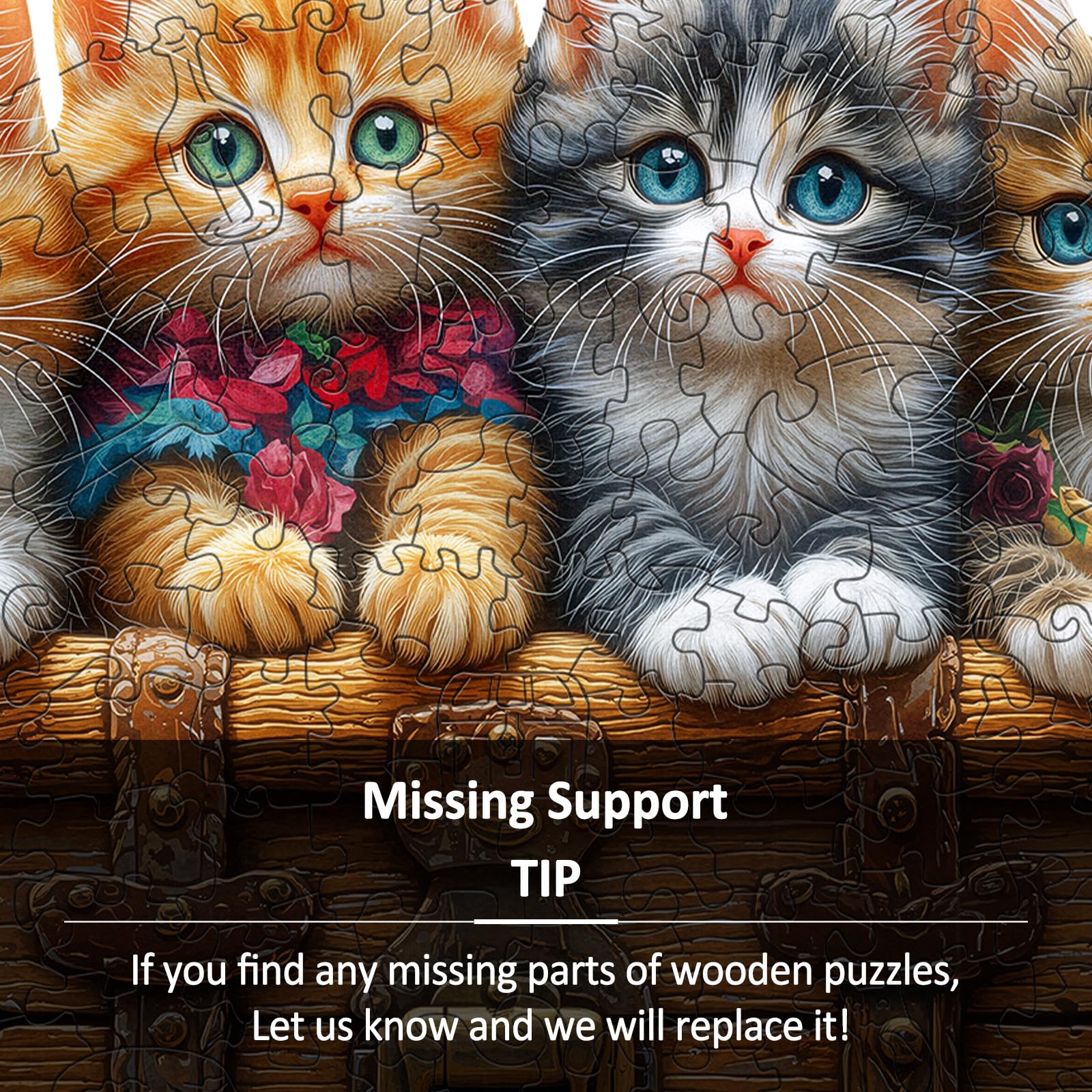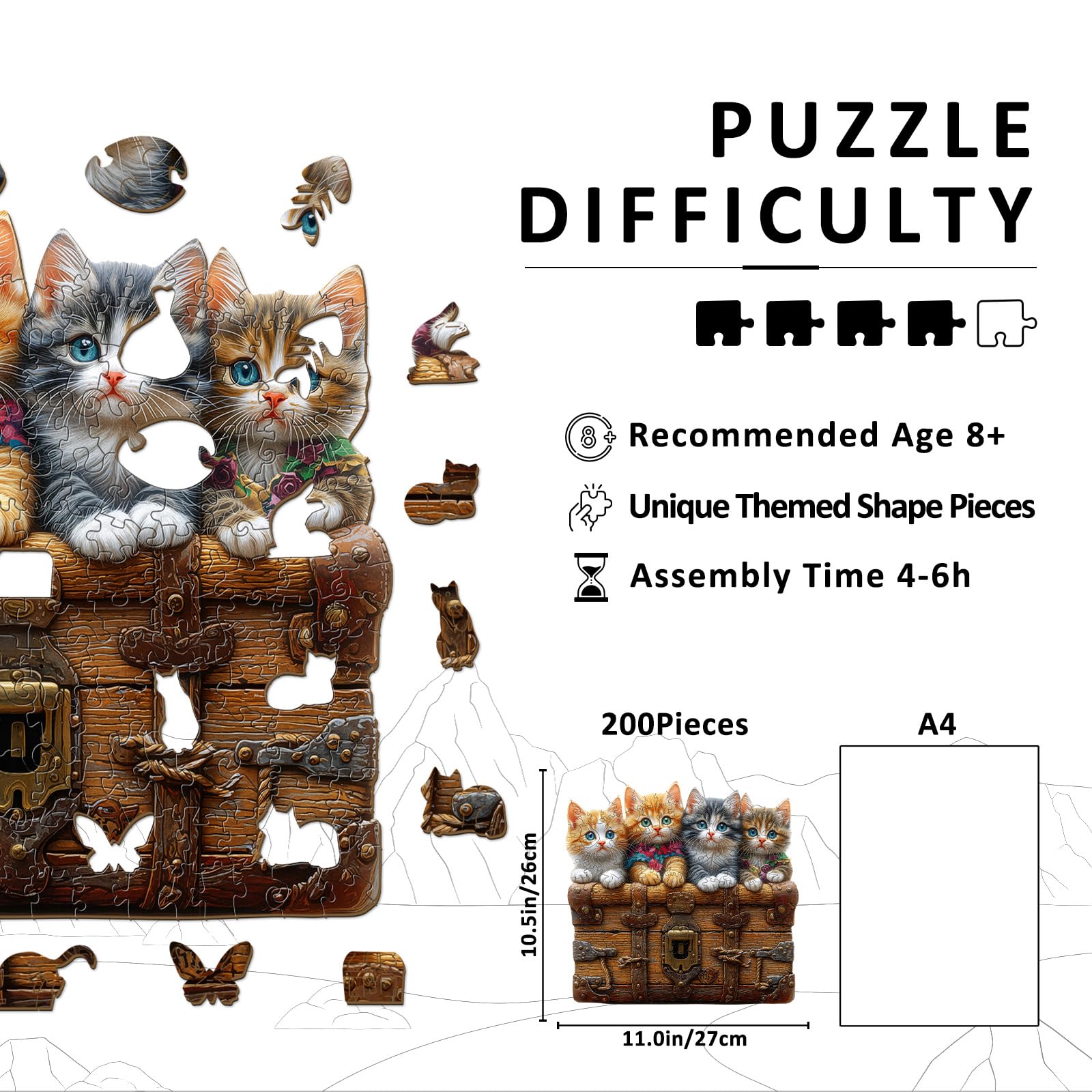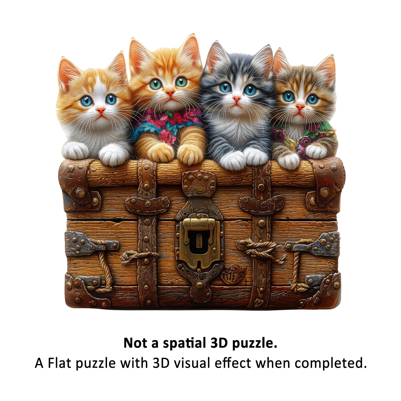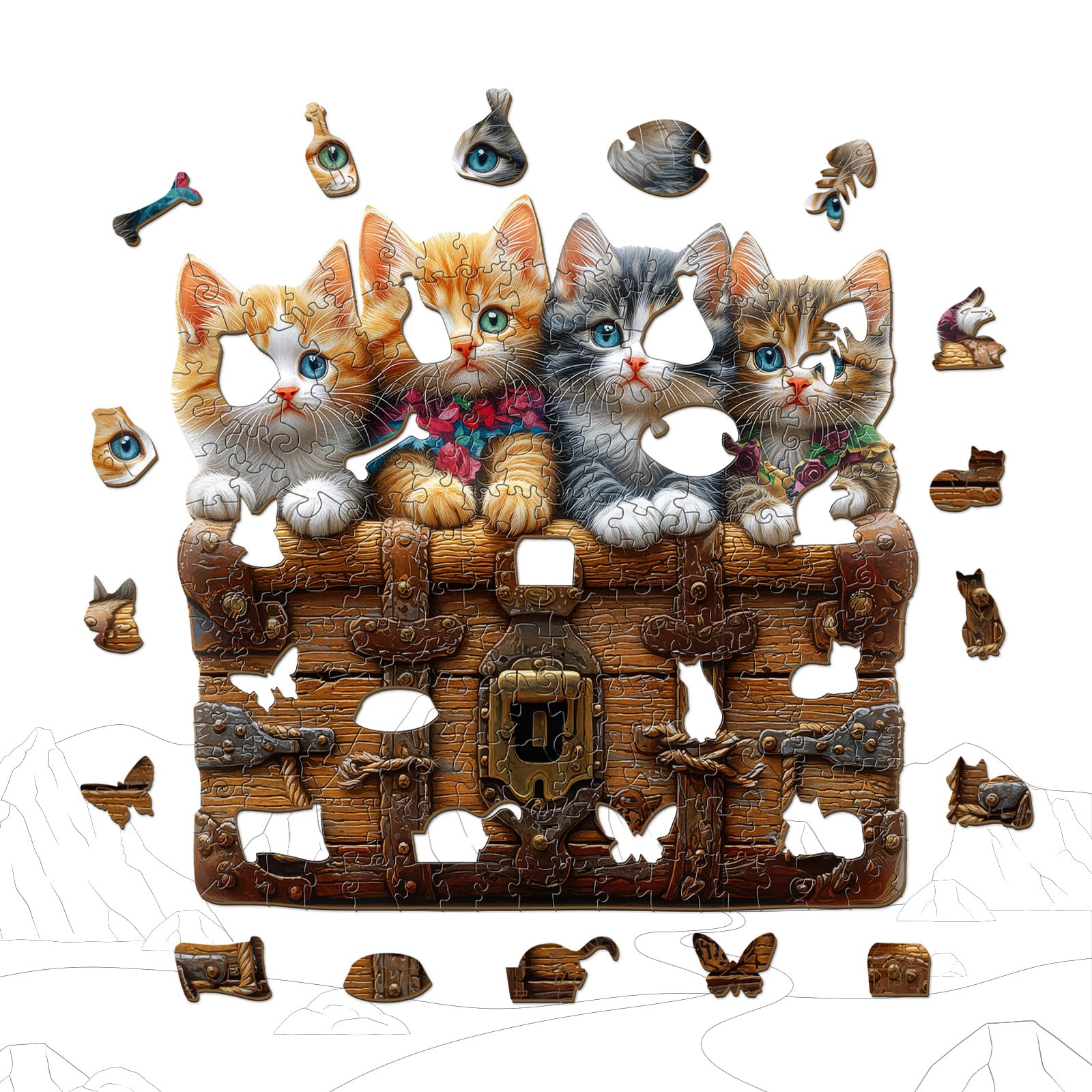 - 【Wooden Puzzles for Adults】 This wooden puzzle features four adorable kittens with bright eyes peeking over a vintage wooden chest, their fluffy fur and colorful accents making the scene charming and vivid.