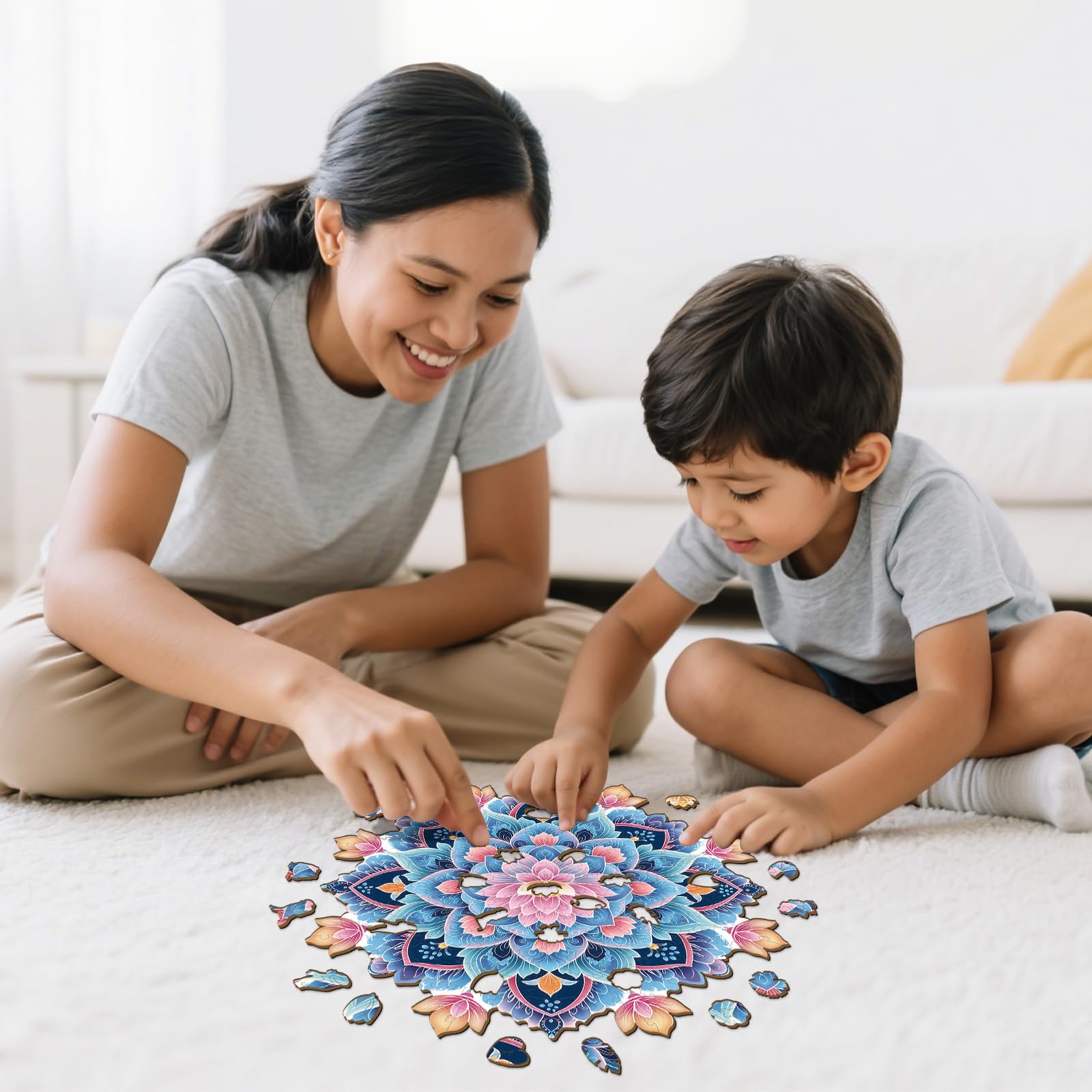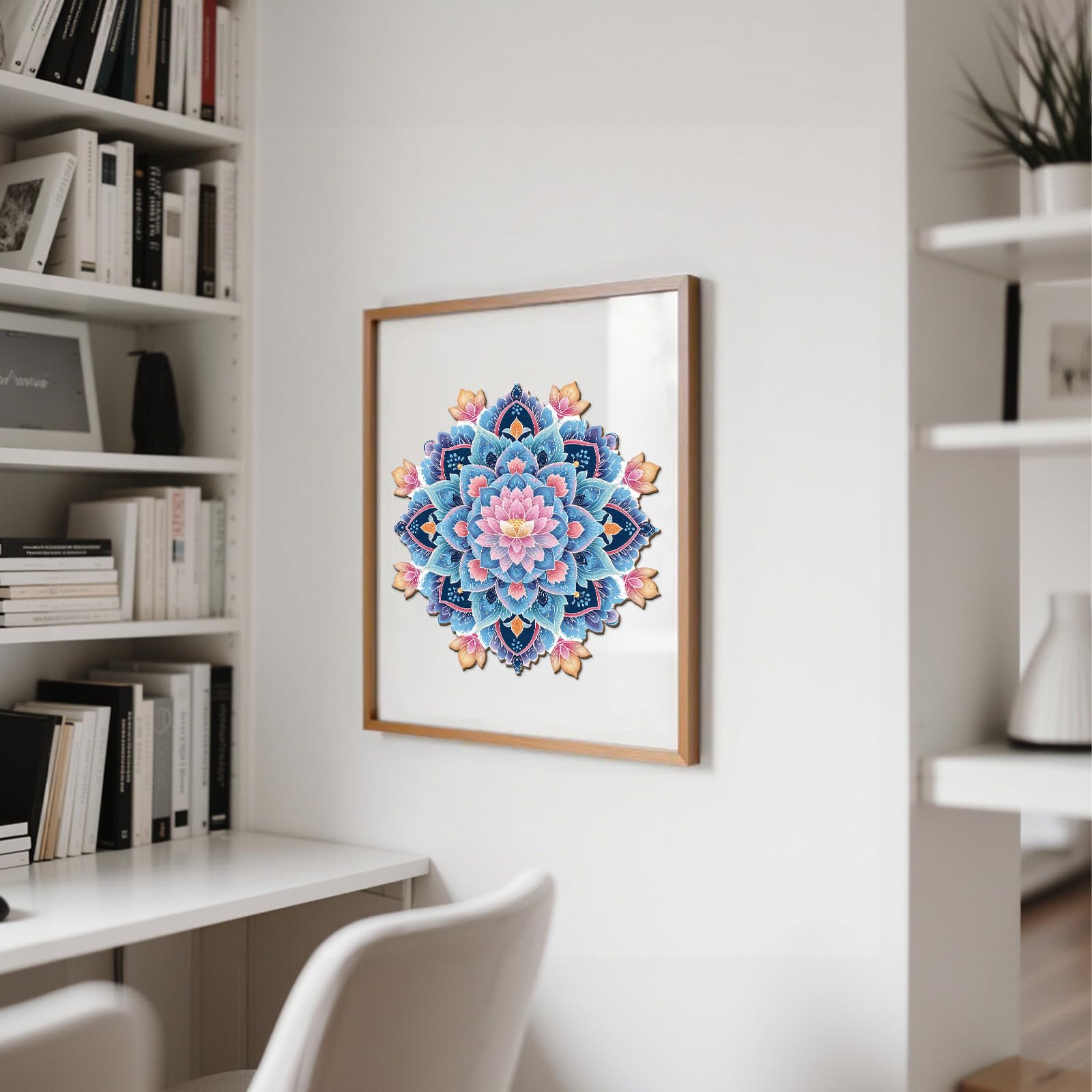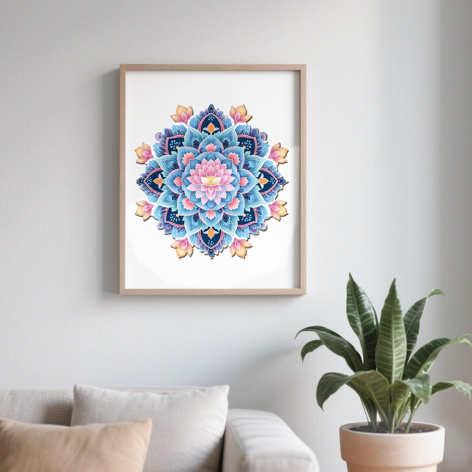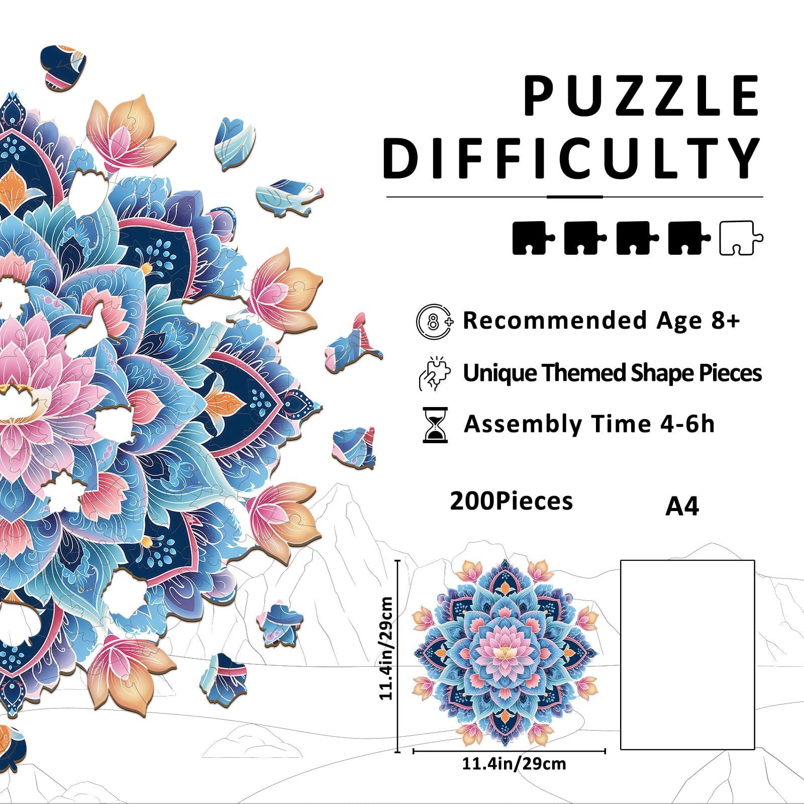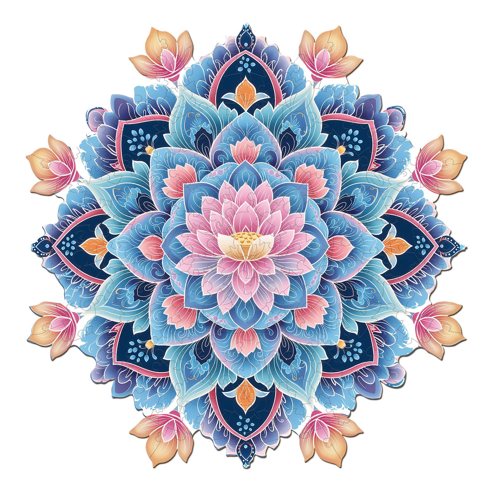 - 【Wooden Puzzles for Adults】This puzzle features a symmetrical mandala features a soft - pink lotus at its core, surrounded by layered blue - purple petals. Delicate patterns and peach - hued leaves frame the design. Intricate details and harmonious colors create a unique puzzling experience.