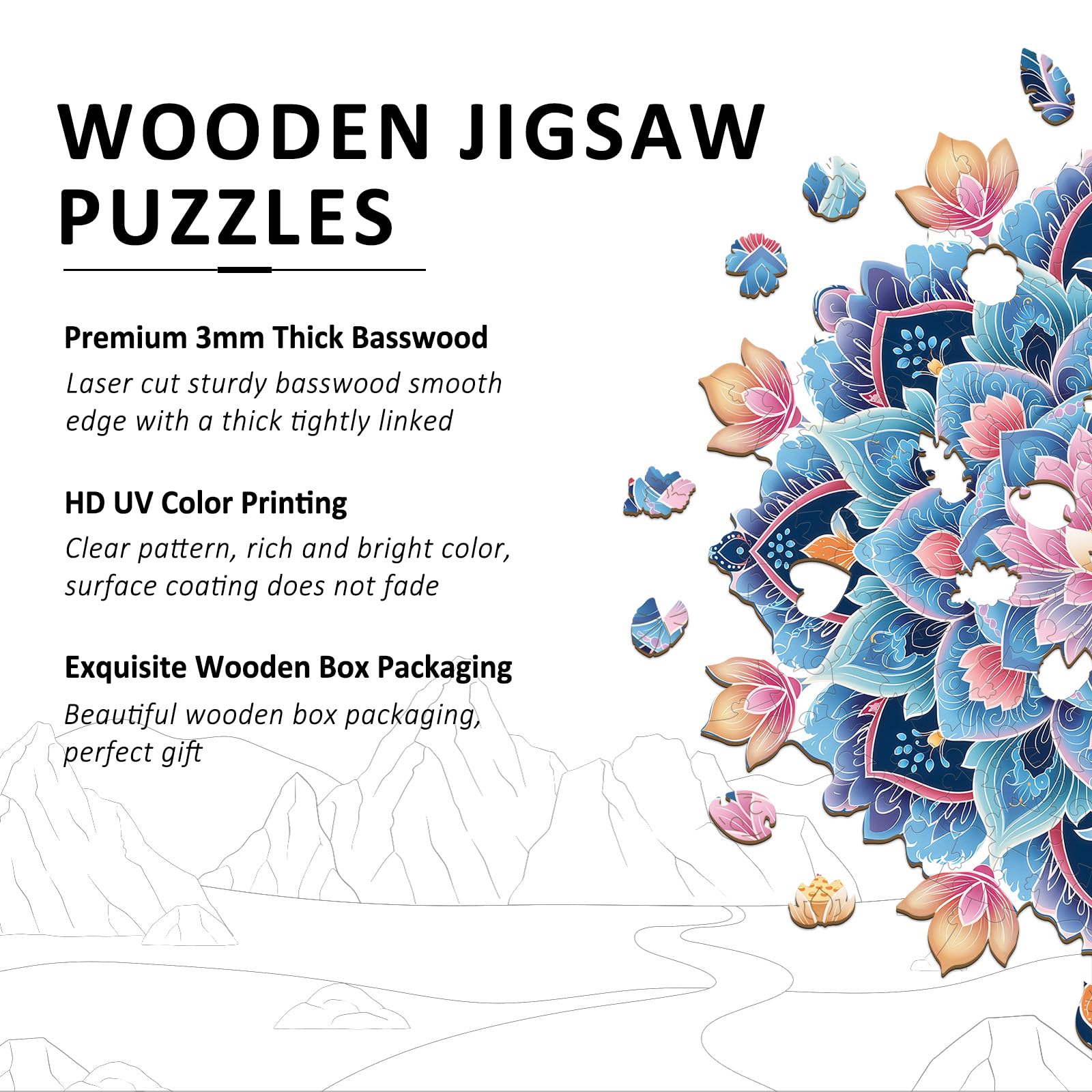 Expertly crafted from select basswood, laser-cut to ensure tight interlocking, our wooden puzzles guarantee seamless fit and precision.
