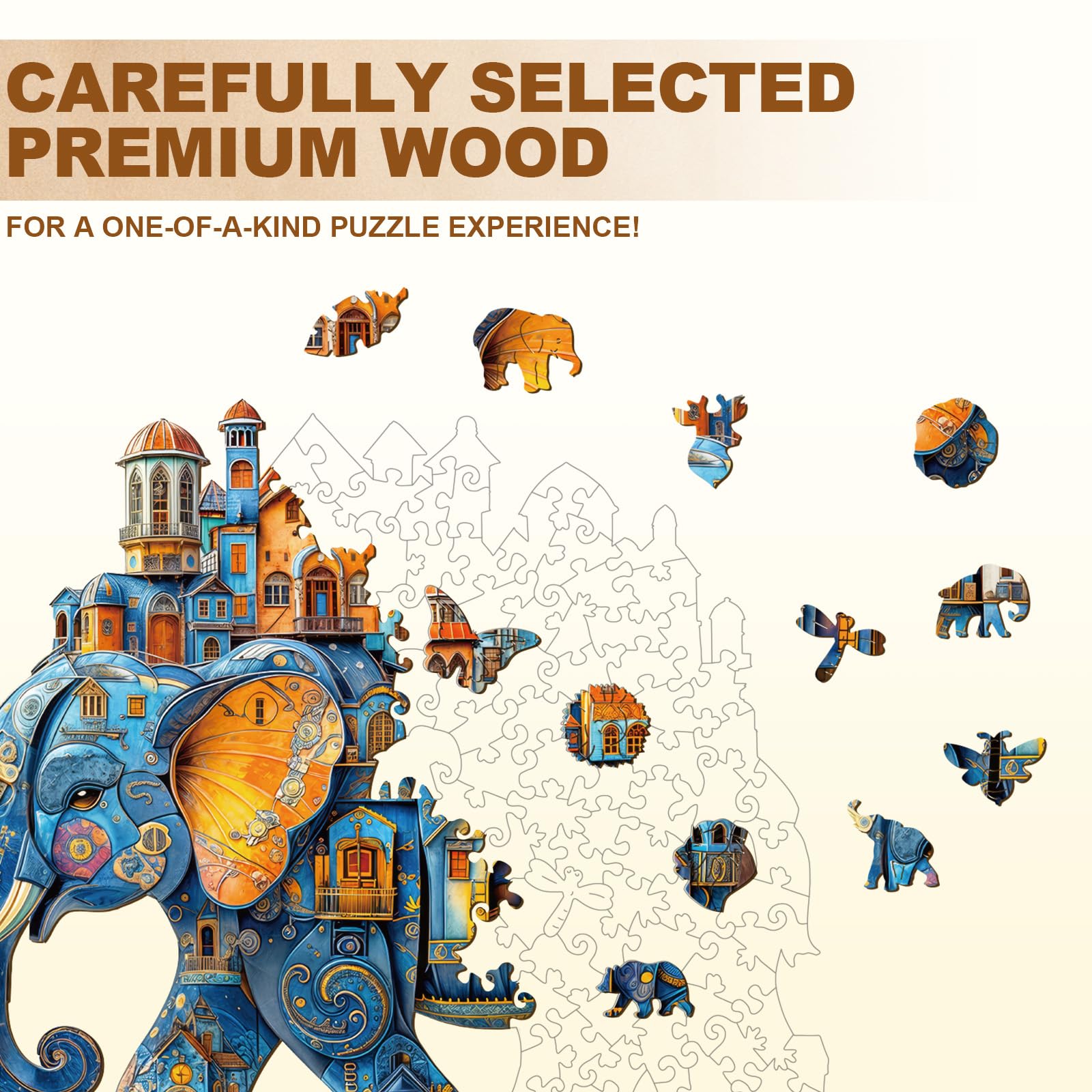 - 【Wooden Puzzles for Adults】 This wood puzzle depicts a fantastical elephant carrying a cluster of charming, colorful houses on its body, with intricate details and a dreamy, whimsical style.