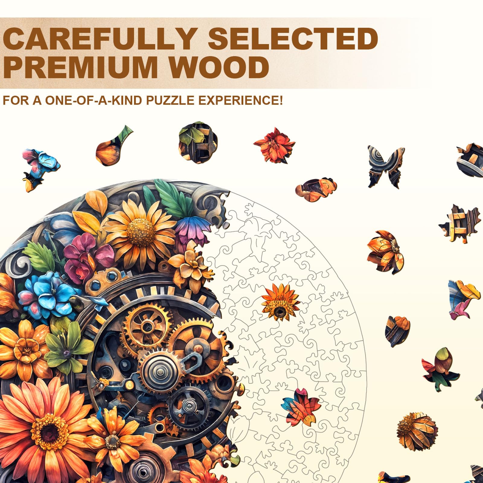 - 【Wooden Puzzles for Adults】This round wooden puzzle presents a scene where intricate steampunk gears are surrounded by vibrant, colorful flowers. The detailed design blends mechanical elements with floral beauty, creating a visually striking piece.