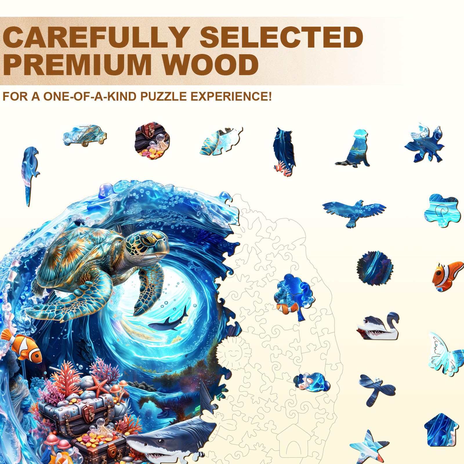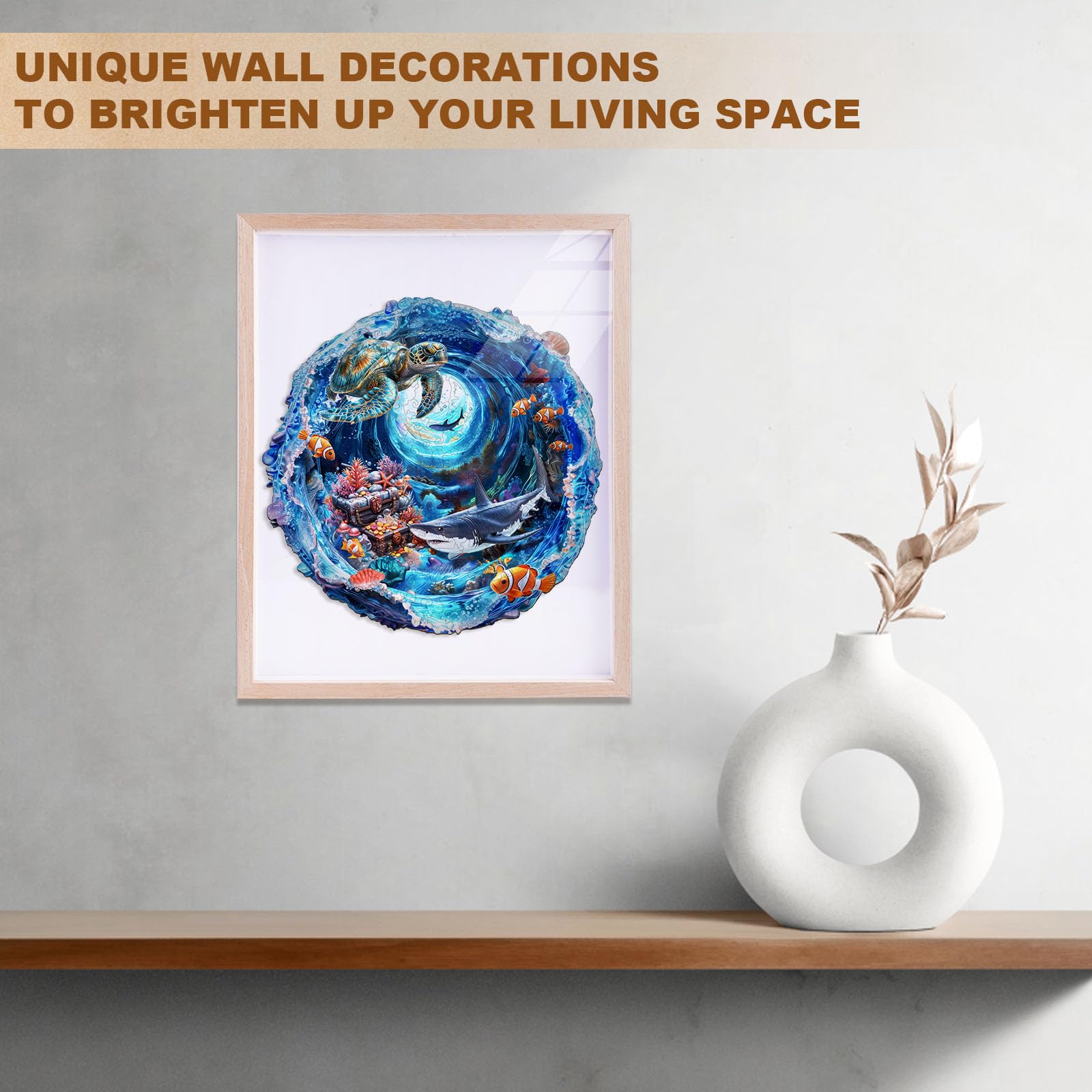 - 【Wooden Puzzles for Adults】 This wood puzzle depicts a circular underwater scene with a turtle, a shark, clownfish, and treasure chests amid vibrant corals and swirling blue waves, bringing a vivid ocean adventure to life.