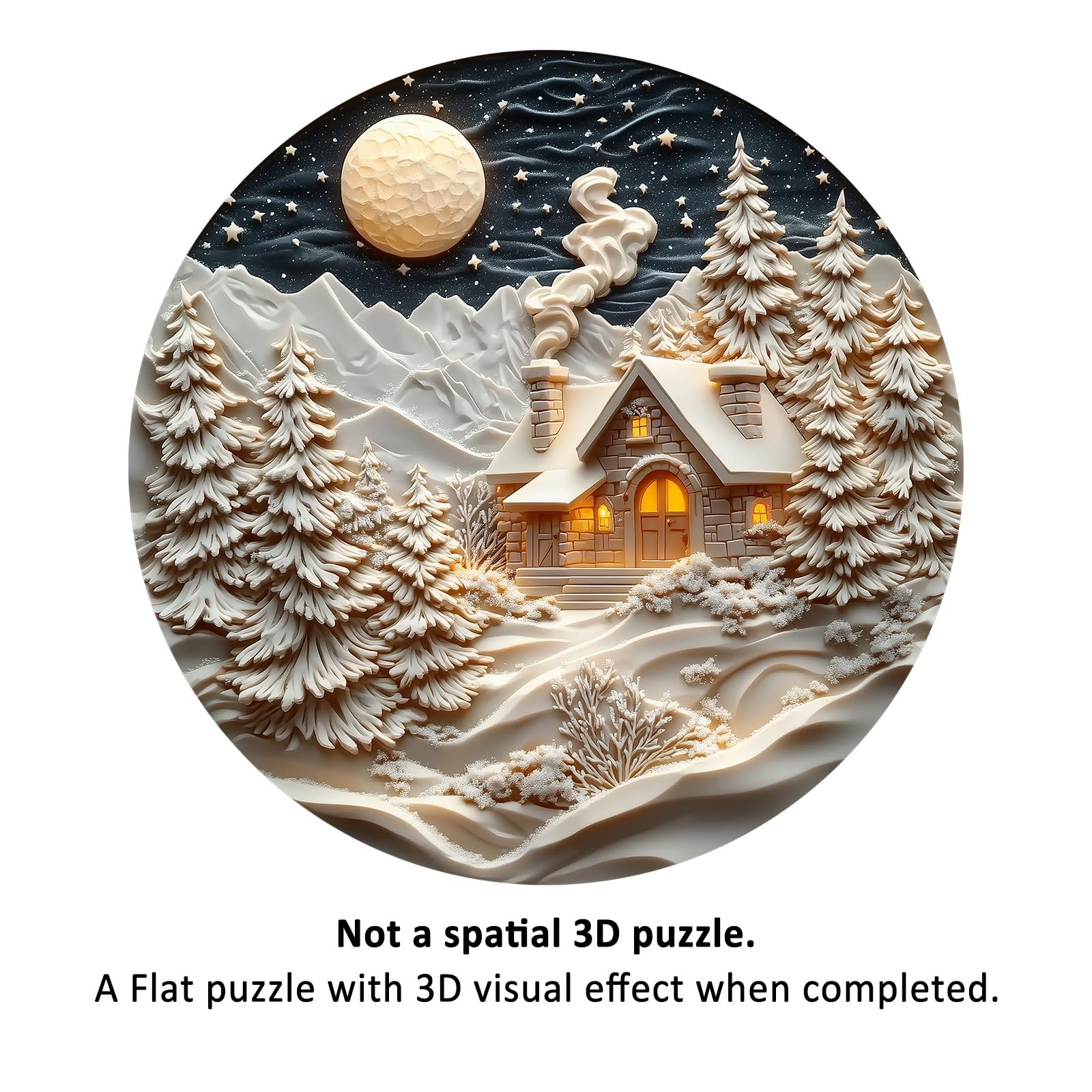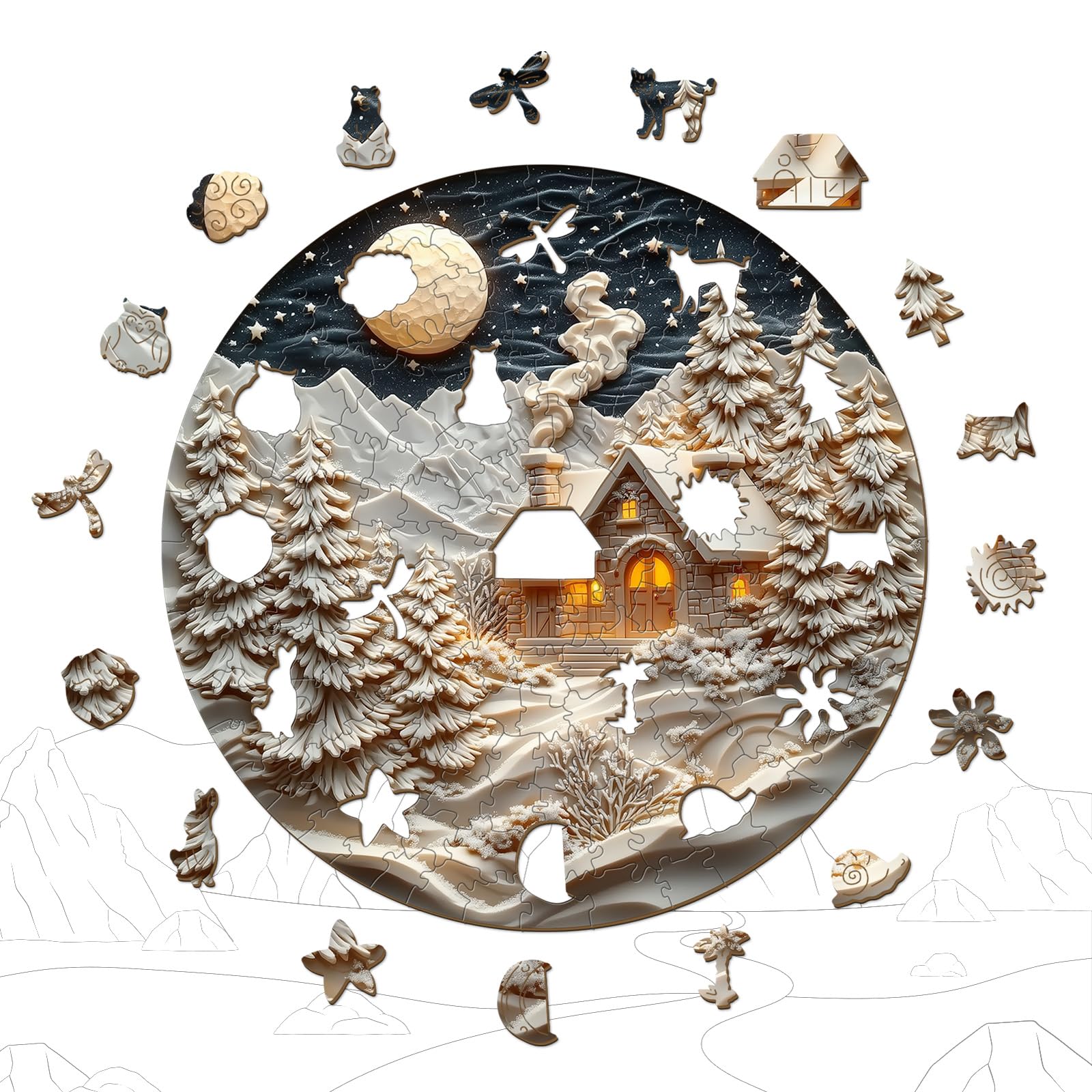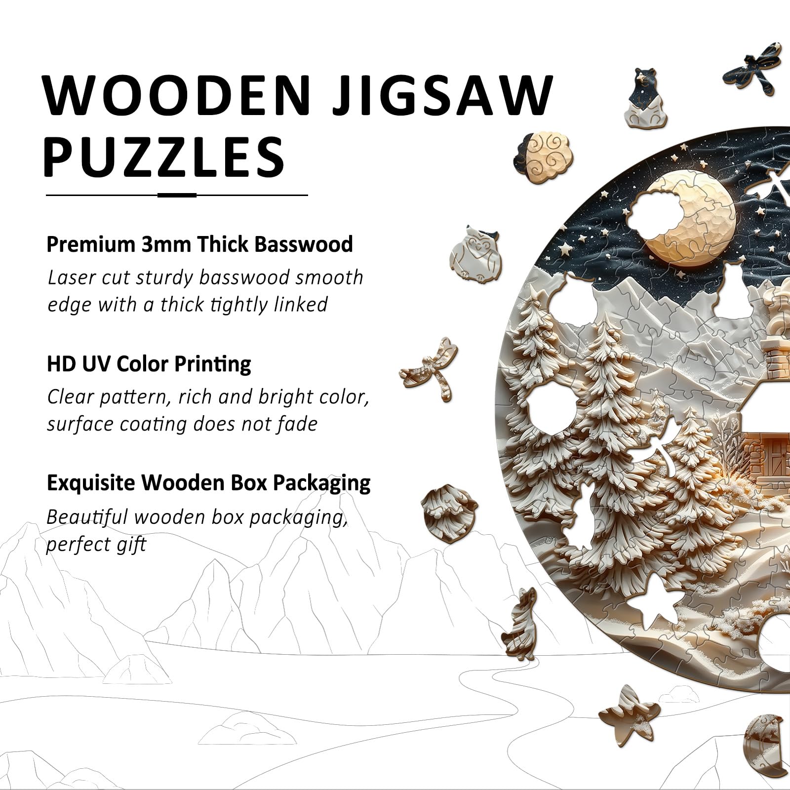 - 【Wooden Puzzles for Adults】 This wooden puzzle shows a circular winter scene: a cozy cabin with warm lights, snow - covered pine trees, mountains, and a bright full moon under a starry sky, creating a tranquil snowy night atmosphere.
