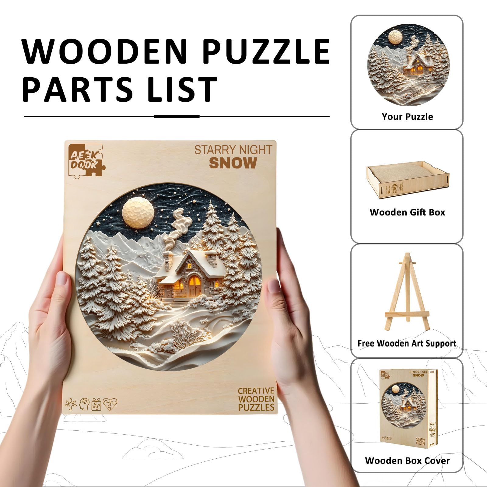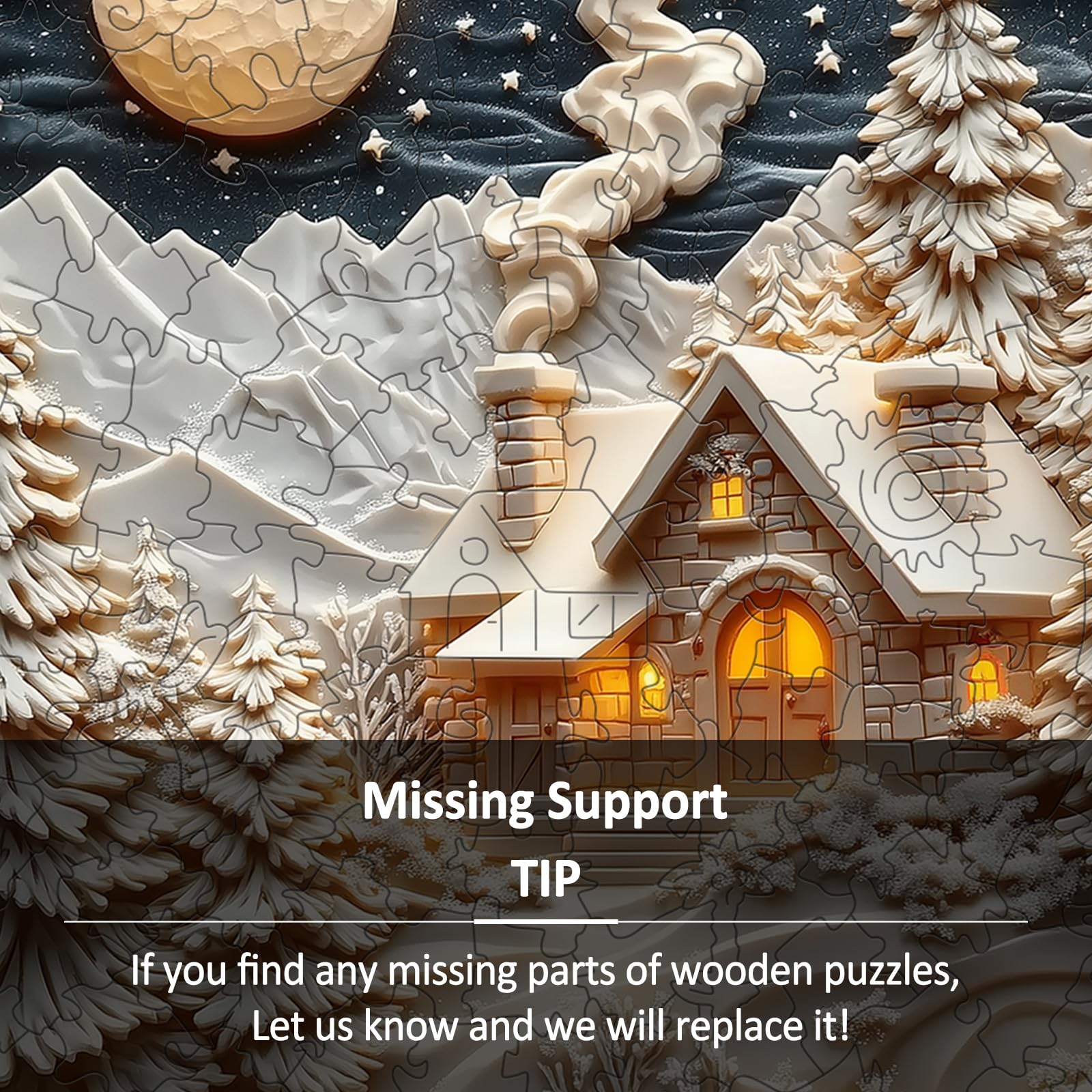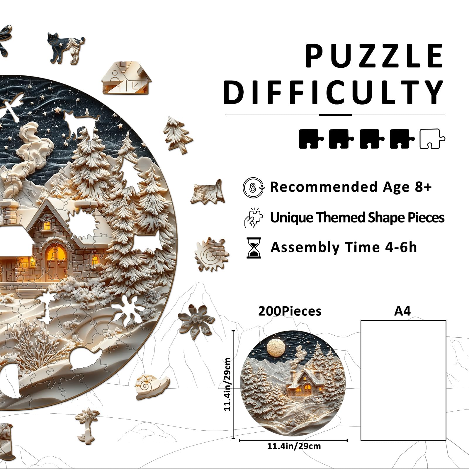 - 【Wooden Puzzles for Adults】 This wooden puzzle shows a circular winter scene: a cozy cabin with warm lights, snow - covered pine trees, mountains, and a bright full moon under a starry sky, creating a tranquil snowy night atmosphere.