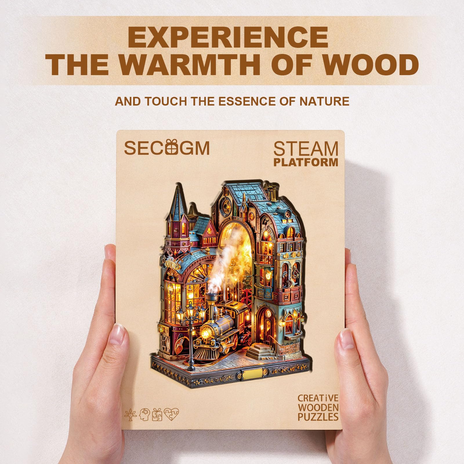 - 【Wooden Puzzles for Adults】It shows a steampunk - style building with a glowing steam train. Intricate details, lights, and mechanical designs create a magical, vintage - futuristic scene, perfect for puzzle and steampunk lovers.